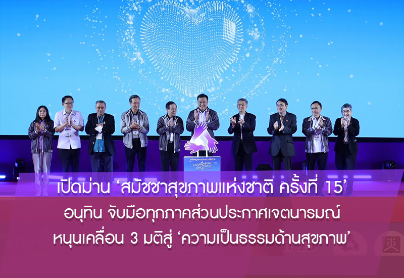 เปิดฉากเวทีสมัชชาสุขภาพแห่งชาติ ครั้งที่ 15 “อนุทิน” ร่วมหนุนทุกภาคส่วนประกาศเจตนารมณ์ขับเคลื่อนมติ 3 ระเบียบวาระ หนุนใช้ BCG ยกระดับเศรษฐกิจครัวเรือนฐานราก – สะสมข้อมูลการออกกำลังกาย การเล่นกีฬาของประชาชน เป็นข้อมูลกลางเพื่อสร้างสังคมสุขภาวะ – สร้างระบบหลักประกันรายได้ ดันเป็นวาระแห่งชาติ เพื่อความมั่นคงและการมีคุณภาพชีวิตที่ดีในวัยสูงอายุให้กับประชาชนทุกคน