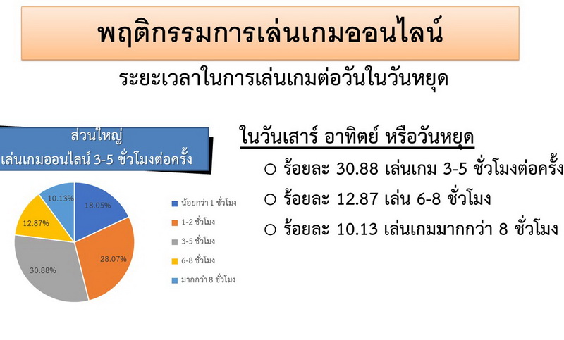 ดร.ธีรารัตน์ กล่าวว่า จากผลการวิจัยของ สสดย. เรื่องการศึกษาการเล่นเกมของเด็กไทย : สถานการณ์ความรับผิดชอบทางสังคมและข้อเสนอนโยบาย พบว่าพฤติกรรมการเล่นเกมของเด็กไทยส่งผลกระทบต่อพฤติกรรมและสุขภาพ อาทิ เนื้อหาเกมที่รุนแรงไม่เหมาะสมตามช่วงวัย การเล่นเกมที่ใช้เวลามากเกินพอดี ทั้งนี้ จากการเก็บข้อมูลในกลุ่มนักเรียนระดับมัธยมศึกษาปีที่ 1-6 ตลอดจน ปวส. และปริญญาตรี จำนวน 3,292 คน เด็กกว่า 85% ที่ตอบว่าเคยเล่นเกม พบอีกว่าเกือบ 1 ใน 3 เล่นเกมเป็นประจำทุกวัน และมีถึง 10% ที่เล่นมากกว่าวันละ 5 ชั่วโมง ส่วนในวันหยุดมีกลุ่มตัวอย่างถึง 18.05% ที่เล่นมากกว่า 8 ชั่วโมงต่อวัน นอกจากนี้ หากพิจารณาเป็นรายภูมิภาคจะพบว่า กลุ่มตัวอย่างที่อาศัยอยู่ในภาคตะวันออกเฉียงเหนือ เล่นเกมมากกว่าวันละ 5 ชั่วโมง ซึ่งเป็นตัวเลขที่สูงกว่าภาคอื่นอย่างมีนัยสำคัญ