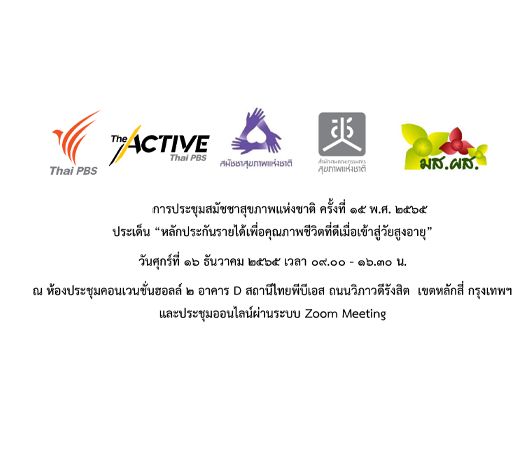 ขอเชิญร่วม การประชุมสมัชชาสุขภาพแห่งชาติ ครั้งที่ 15 พ.ศ. 2565 ประเด็น “หลักประกันรายได้เพื่อคุณภาพชีวิตที่ดีเมื่อเข้าสู่วัยสูงอายุ” วันศุกร์ที่ 16 ธันวาคม 2565 เวลา 09.00 - 16.30 น. ณ ห้องประชุมคอนเวนชั่นฮอลล์ 2 อาคาร D สถานีไทยพีบีเอส ถนนวิภาวดีรังสิต เขตหลักสี่ กรุงเทพฯ และประชุมออนไลน์ผ่านระบบ Zoom Meeting