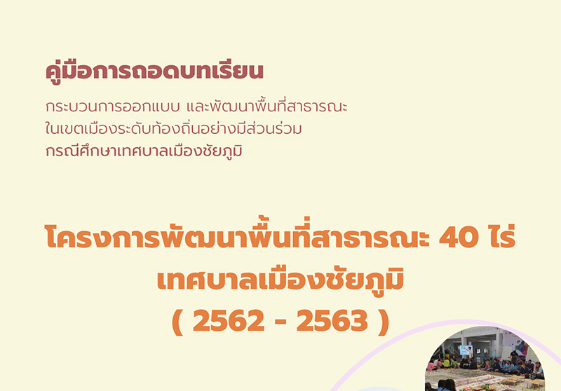 คู่มือการออกแบบพัฒนาพื้นที่สาธารณะเพื่อสุขภาวะอย่างมีส่วนร่วมฉบับนี้ เกิดมาจากการรวบรวมประสบการณ์ เทคนิค และข้อมูลความเข้าใจเบื้องต้นที่ได้เรียนรู้ผ่านกรณีศึกษา การออกแบบเทศบาลเมืองชัยภูมิ